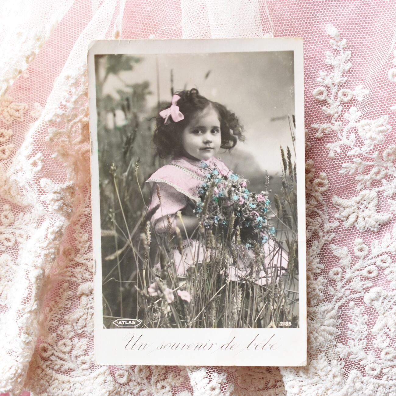 お花摘みをするあどけない表情が愛らしい少女のアンティークポストカード。